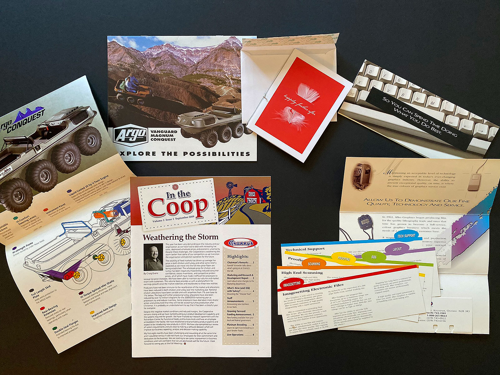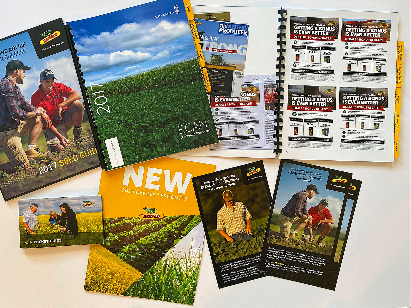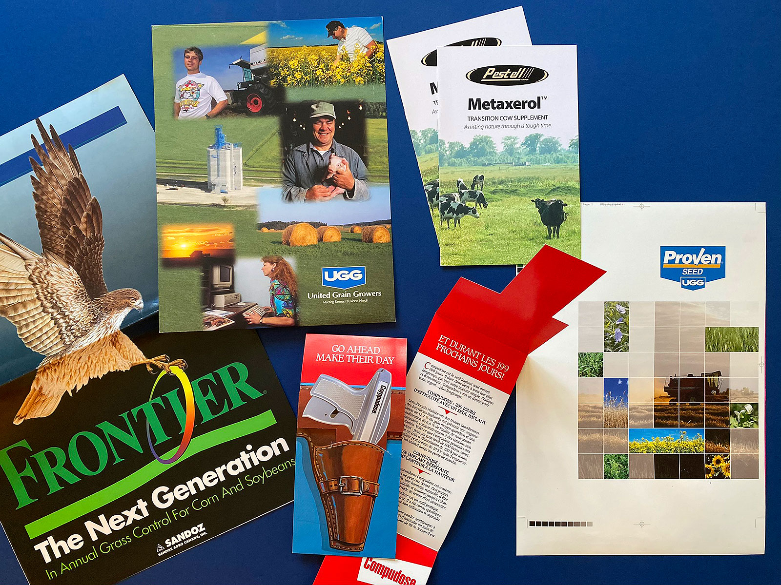 United Grain Growers, Elanco, Sandoz and Pestell. Die-cut brochureware and advertising materials.